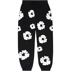 Denim Tears Black White Sweatpants feature a puff-printed wreath design, made from 100% cotton with a relaxed, true-to-size fit.