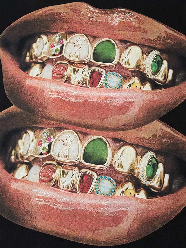Luxury meets elegance, Gold & Jade Unique Grills Lip Print T-Shirt. Unique design exudes unparalleled taste and individual charm.